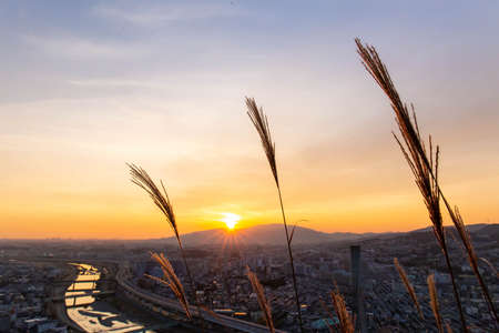 Silhouette of tall reeds or silver grass taken against the sunset. Taken in Haneul Park, Seoul, South Korea