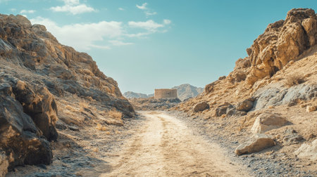 A tranquil desert pathway winds through rocky hills, leading to an old structure. The serene landscape captures the essence of nature and exploration.