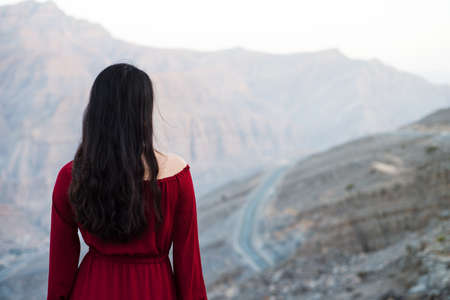 Woman enjoying dessert valley and mountain scenery wearing red dress