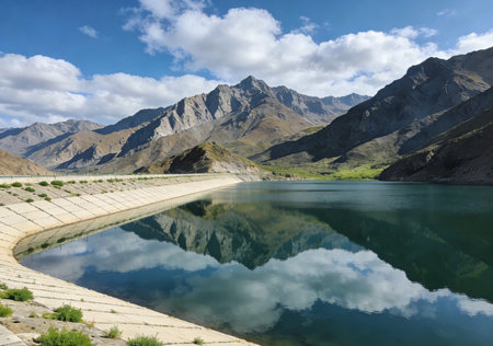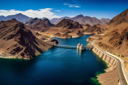 Geological landscape of hatta dam characterised by dry and rocky mountains and lake between scenery mountains, water reservoir Between hills in Dubai, United Arab Emirates