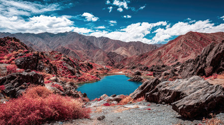 A scenic landscape presents a vibrant mountain lake surrounded by reddish rocky formations. The image features a clear blue sky dotted with clouds, and varied color on the distant mountain range. It showcases natural textures and a high-angle composition, suitable for travel, tourism, and environmental projects.