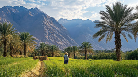 A farmer standing in a field of date palm trees, with a mountain range in the background.