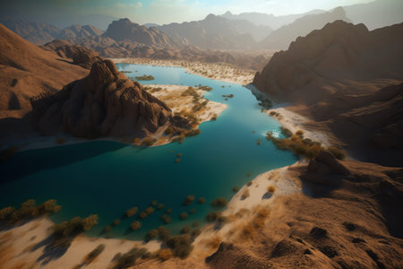 Aerial view of a desert oasis nestled amidst rocky mountains