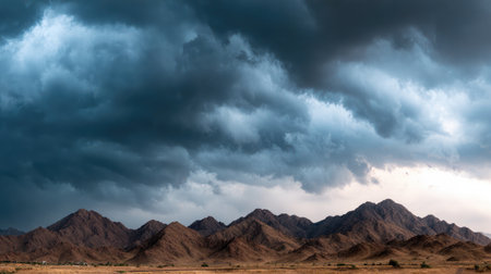 A breathtaking view of storm clouds looming over a rugged mountain range at dusk, capturing the raw beauty and atmospheric tension of nature's landscape.
