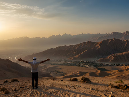 Arab man enjoying Jais desert mountain view in Ras al Khaimah UAE