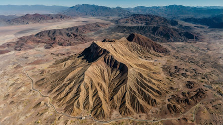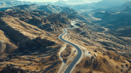 Top view of a winding road through rugged mountain terrain with vast open space. Ideal for travel and adventure themes