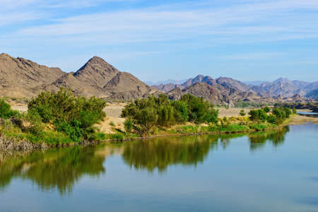 dry riverbed between arid and rocky Mountains with copy space in the sky, Ras Al Khaimah Emirates, United Arab Emirates (UAE), Middle East