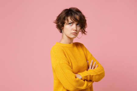 Offended pensive young brunette woman girl in yellow sweater posing isolated on pastel pink background studio portrait. People lifestyle concept. Mock up copy space. Holding hands crossed, looking up.