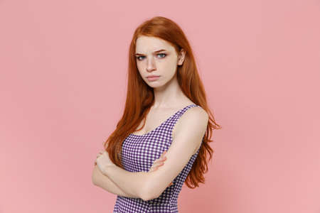 Side view of bewildered young redhead woman girl in plaid dress posing isolated on pastel pink background in studio. People lifestyle concept. Mock up copy space. Holding hands crossed looking camera.
