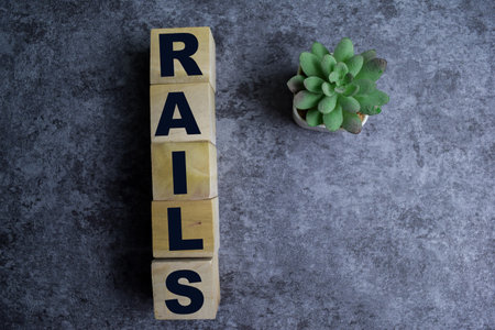 Concept of The wooden Cubes with the word Rails on wooden background.