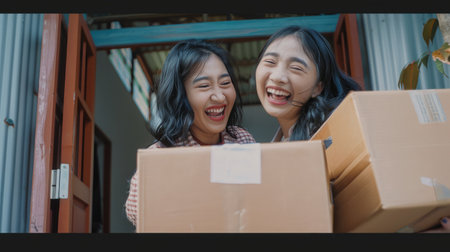 Two Young Asian women are happy and excited after a new order from SME customer, commercial checking, online marketing, Entrepreneur packing boxes