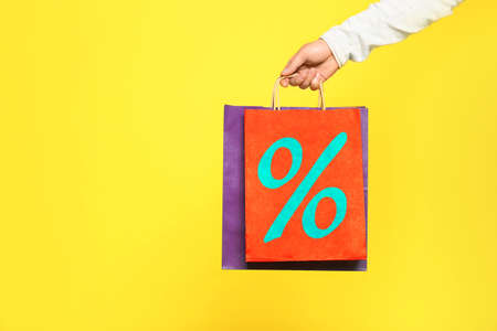 Man holding paper shopping bag with percent sign on yellow background, closeup. discount concept