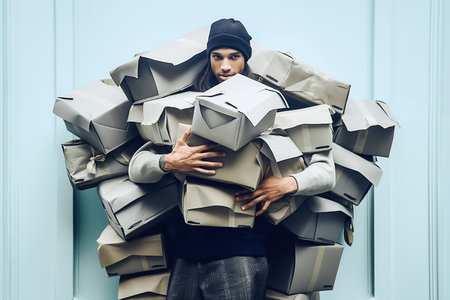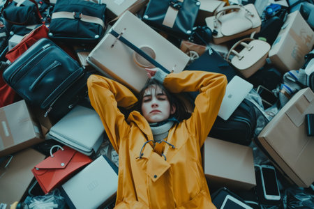 A determined woman in a bright yellow rain jacket stands in a lush forest, holding a box filled with waste items, promoting awareness for environmental conservation.