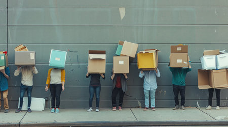 Close-up of a person's hands placing gently used clothing into a donation bin, with a focus on the act of giving, set against a backdrop of a busy city street, promoting urban recycling and charity.