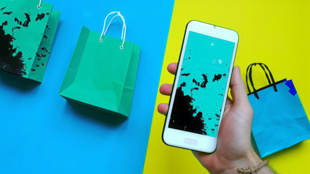 Colorful shopping concept with smartphone and vibrant bags on bold background