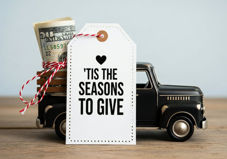 A car carrying a price tag with the text 'TIS THE SEASONS TO GIVE