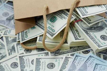 Selective focus on detail of USD banknotes. Counting or giving United States Dollars banknotes. World money concept, inflation and economy concept
