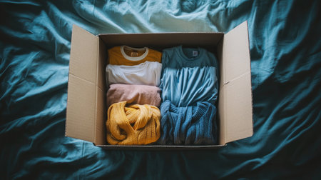 A neatly arranged box of colorful clothing sits atop soft bedding, showcasing an inviting selection of textiles perfect for casual style and comfort in daily wear.