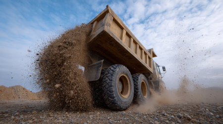 A heavy dump truck unloads dirt at a construction site, creating a dramatic dust cloud against a blue sky. The scene captures industrial activity.