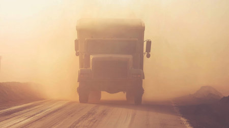 A construction truck emerges through thick dust on a gravel road, illuminated by the warm hues of an orange sunrise, capturing the essence of industry and nature.