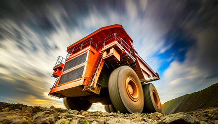 Close-up, bottom view and front view of a very large orange and black dump truck at a coal mine, the action scene is blurred with dramatic sky on background. Generative Ai.