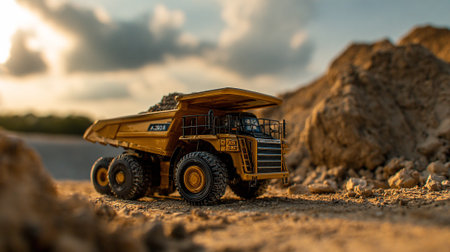 A detailed shot shows a yellow toy mining truck positioned on a sandy surface, with blurred rocky terrain in the background. The image evokes a sense of adventure and industry.