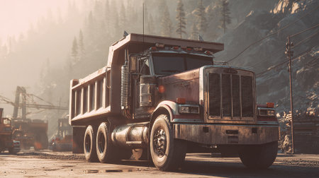 A large, rusted dump truck sits parked at a construction site amidst rugged, mountainous terrain. Other construction vehicles and equipment are faintly visible in the background adding to the industrial scene.