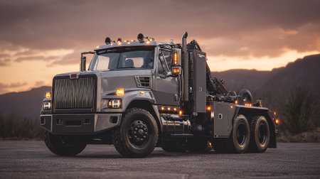 A large gray tow truck parked on a gravel road at sunset with mountains in the background