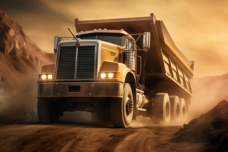 Gigantic mining dump truck driving through rugged terrain at sunset, surrounded by swirling dust clouds. Generative AI
