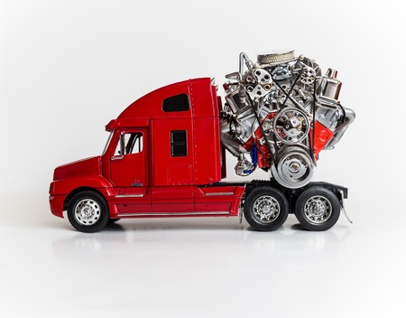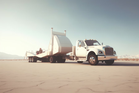 Generative AI : Broken Big rig industrial professional white semi truck with open hood and long haul semi trailer standing on the road shoulder trying to fix breakdown in place and
