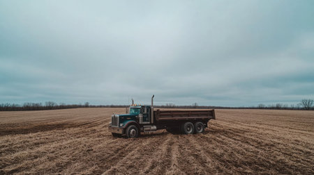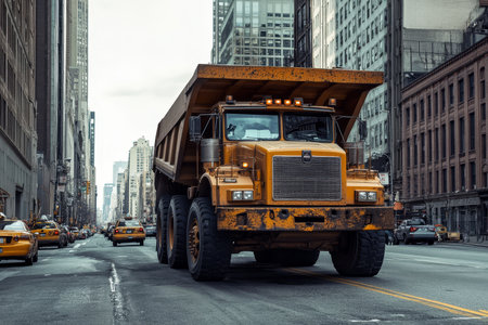 A dump truck is driving through a rainstorm. The rain is falling in large drops, creating a wet and slippery surface. The truck is the main focus of the image with Generative AI