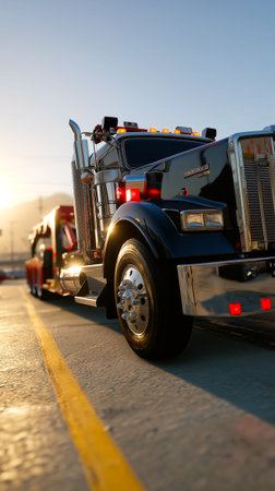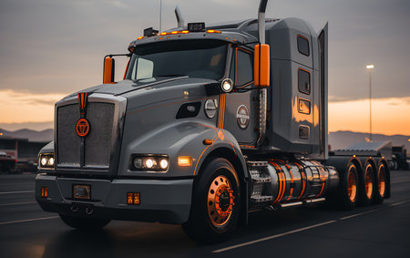 Modern Semi-Truck Cargo Transportation with Sunset at Port for Global Commerce
