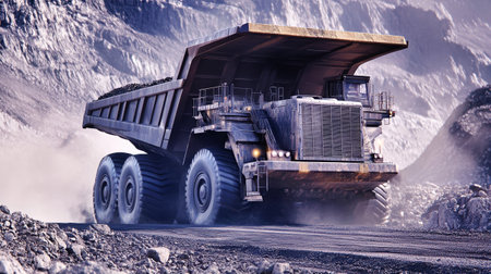 A powerful dump truck navigates a rocky road, delivering coal from the mine to the surface amid clouds of dust.