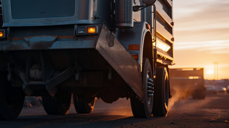 dump truck parked on the side of the road at sunset, captured in a super close-up shot. this low angle photograph, taken with the high detailed sony alpha a7 mark iv, showcases the realistic details of the truck. the image is shot in 8k resolution, providing a stunning visual experience. ai generated