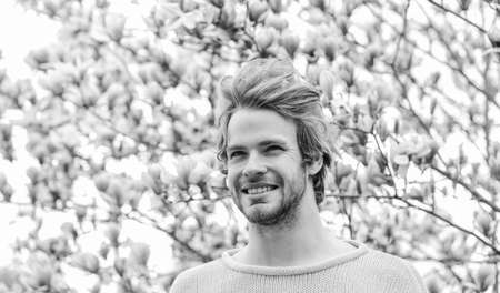 Joy of spring. Man flowers background. Spring beauty. Hipster enjoy blossom. Springtime concept. Guy relax in flowers park. Botanical garden. Freshness and awakening. Spring inspiration. April may