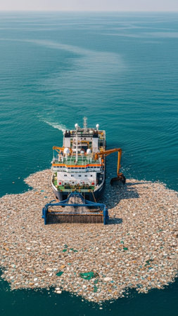 An imposing vertical aerial shot of a specialized ocean cleanup barge centered in the frame, activel