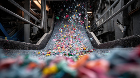 Dynamic view of the colorful recycling process showing shredded materials cascading down a conveyor belt in an industrial setting. Ideal for environmental themes.