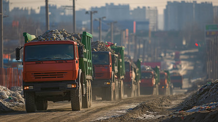 landfill, with waste disposal trucks and conveyor belts moving trash to the site, created with generative ai