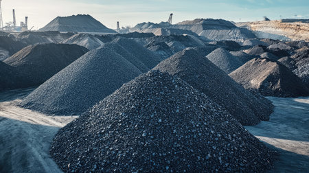 Massive stockpiles of minerals stacked high, prepared for export in a busy industrial yard on a bright day, highlighting logistics and global trade.