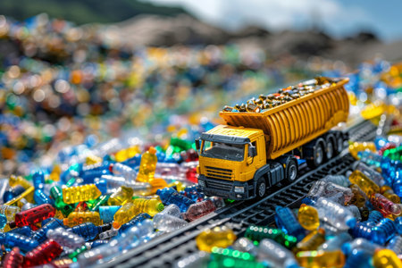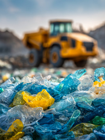 Vibrant plastic debris gathered in a heap beneath a bright sun, with a massive recycling truck softly out of focus in the backdrop of a waste facility.