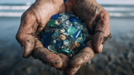 Hands holding microplastic waste on beach symbolizing the impact of water solution. Concept Environmental Awareness, Plastic Pollution, Ocean Conservation, Sustainable Living, Eco-Friendly Solutions