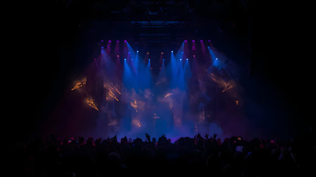 Theater setting with concert, stage lit by colored spotlights.Generative AI