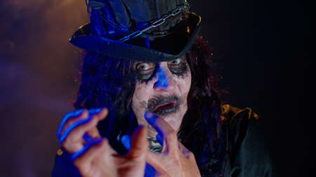 Close-up portrait of a joker man. Stock photo makeup joker in a horror room.