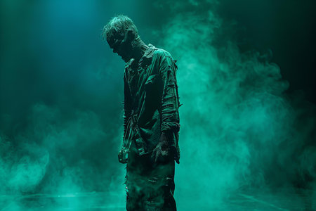 Illustration of zombie standing on the ground, horror photography, spooky atmosphere, full body shot
