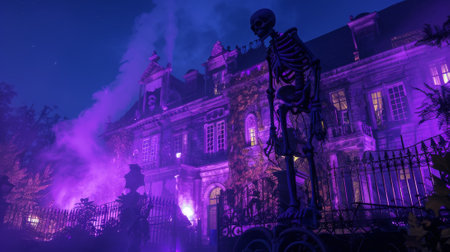 Halloween haunted mansion lit with purple lights at night. Concept of creepy house, spooky skeleton, scary decoration, horror theme.