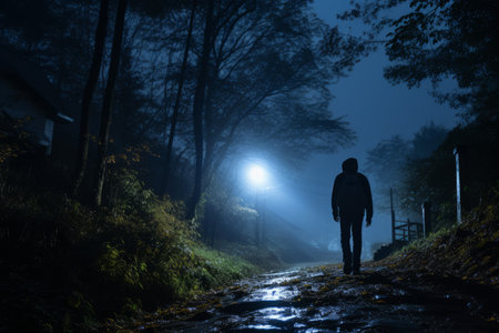 Mysterious silhouette exploring dark streets under dim streetlight. Concept Urban Exploration, Night Photography, Shadowy Figures