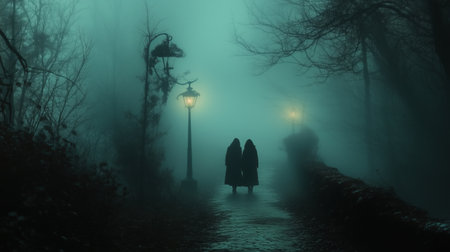 Two mysterious figures are walking on a foggy path in a park at night, illuminated by street lamps, creating a spooky atmosphere. Ai generated