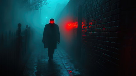A vampire with glowing red eyes lurking in the shadows of a misty alley, symbolizing horror and Halloween fright