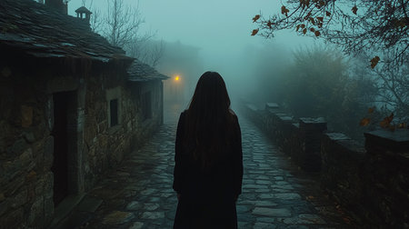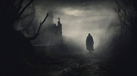 a dark silhouette of a figure walking on a dirt path under an overcast sky. this misty gothic scene is reminiscent of fantastical ruins and haunting figuratives. the captivating documentary-style photo is rendered in cinema4d, showcasing the atmosphere of necronomicon illustrations. ai generated
