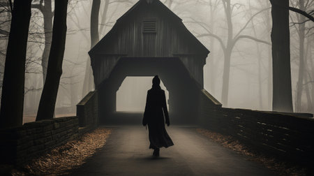 this captivating photograph, a mist-covered bridge stands as an eerie pathway between two worlds. A lone silhouette, appearing as a ghostly apparition, moves gracefully along the fog-laden structure.